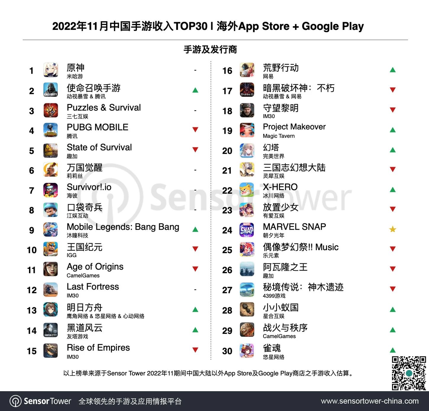 Sensor Tower 商铺情报渠道发布了 2022 年 11 月我国手游产品在海外商场收入及下载量排行榜,具体榜单改变如下。