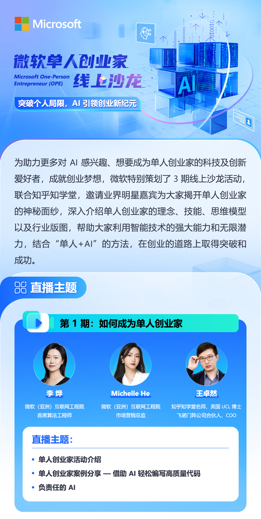 在 AI 和大模型的加持下,企业的增加和立异形式正在产生改动,由此微软全球资深副总裁张祺博士提出“单人创业家(One-Person Entrepreneur)”理念。什么是单人创业家?怎么成为功率提高25%的单人创业家?怎么凭借 AI,实现从思想到实践,全面打破职场天花板,发明功率增加奇观?
